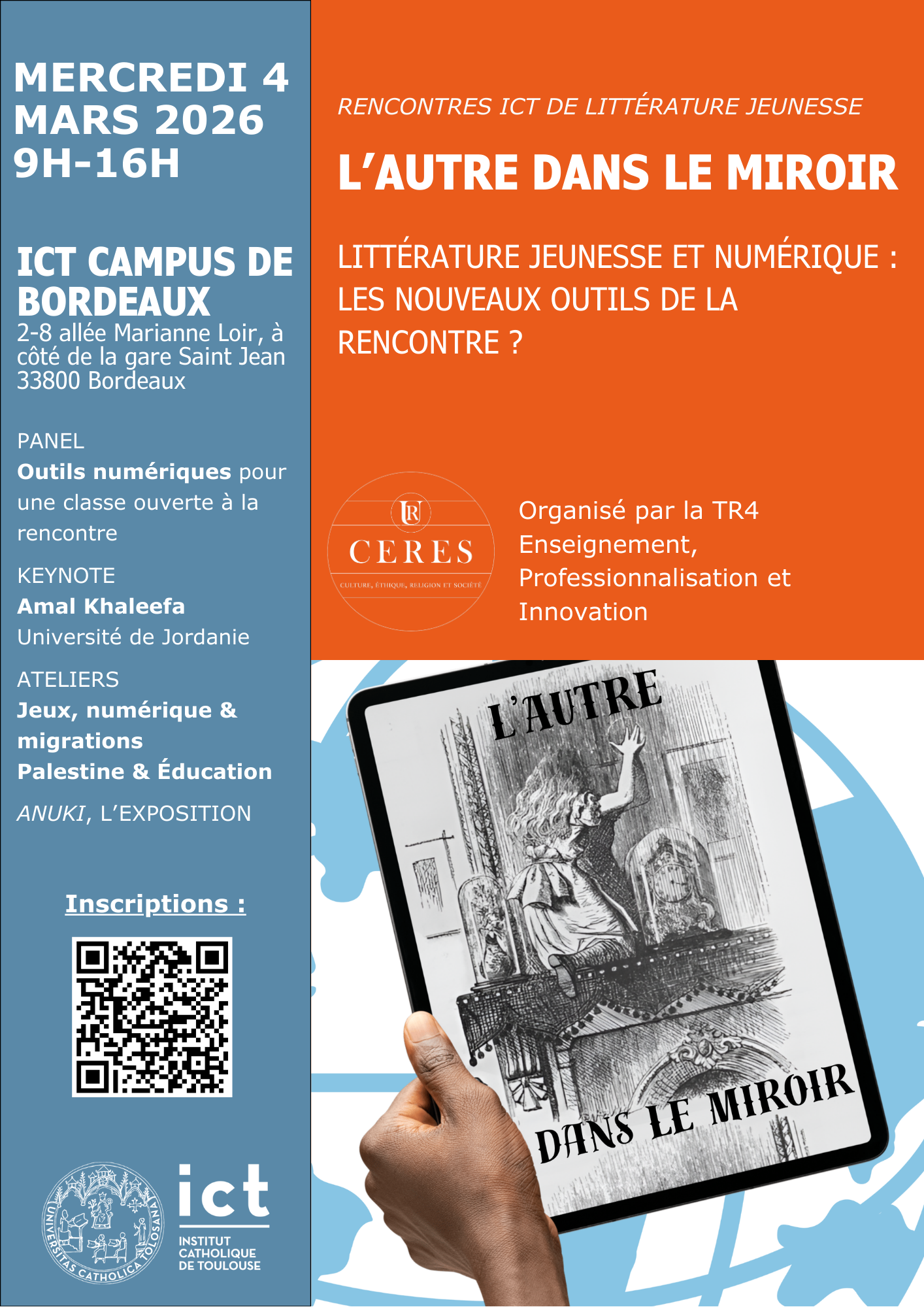 Les 4 et 5 mars prochains se déroulera un colloque international et pluridisciplinaire co-organisé par Patricia Mothes et Audrey Robitaillié, maîtres de conférences à l’ICT, entre les sites de l’ICT respectivement de Bordeaux et Toulouse, intitulé « L’autre dans le miroir : Littérature jeunesse et numérique, les nouveaux outils de la rencontre ? ».
